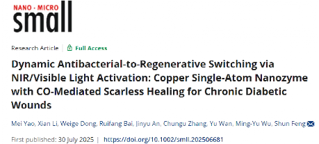近日,工程技术杂志《Small》(JCR,Q1区,2025年影响因子12.1)正式发表了必赢242网址“生命分析技术与材料实验室”题为“Dynamic Antibacterial-to-Regenerative Switching via NIR/Visible Light Activation: Copper Single-Atom Nanozyme with CO-Mediated Scarless Healing for Chronic Diabetic Wounds”的研究成果。2023级博士研究生姚美为论文第一作者,封顺教授为通讯作者,242nte官网为唯一通讯单位。