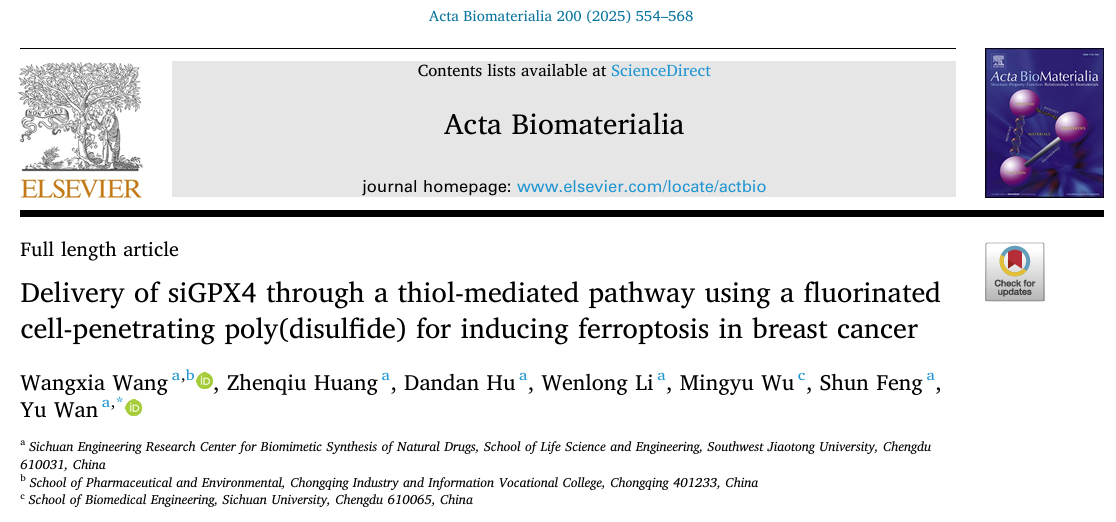 近日,本研究成果以“Delivery of siGPX4 through a thiol-mediated pathway using a fluorinated cell-penetrating poly(disulfide) for inducing ferroptosis in breast cancer”为标题发表在《Acta Biomaterialia》(JCR,Q1区,2025年影响因子9.6)上。必赢242网址硕士研究生王旺霞为本文第一作者,万瑜副教授为本文通讯作者。